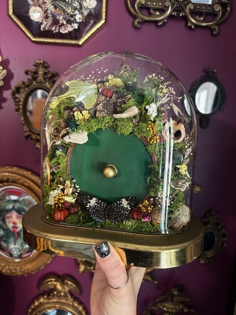 A victorian oval dome with a large green door – Bilbo’s home with a Luna Moth, blue cracker butterfly, bumble bee, and a frog leg beetle, all surrounded by dried florals, and mushrooms, with two labradorite cabochons as stained glass windows.
