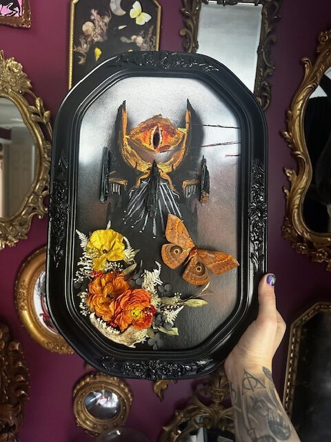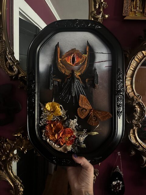 A hand painted eye of Sauron, with 3 pieces of vivianite (the crystal of the dead), a Salassa moth, with dries florals, and a raccoon jaw bone. The frame is dated back to 1930.